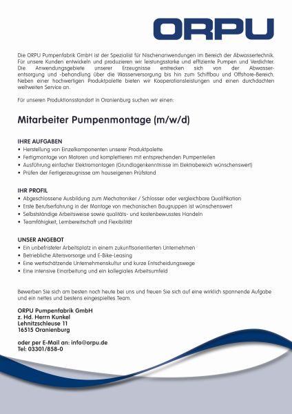 Sie können sich gern initiativ bei uns bewerben. Bewerben Sie sich online oder senden Sie Ihre vollständigen Bewerbungsunterlagen an die Personalabteilung der ORPU Pumpenfabrik GmbH.